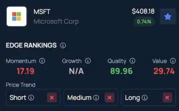 According to Benzinga's Edge Stock Rankings, Microsoft is showing downward price trend across the short, medium and long-term timeframes, while its Quality score ranks in the 89th percentile.