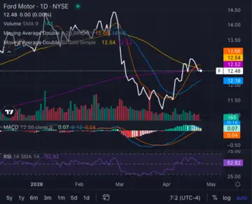 Ford's stock is now trading below key moving averages, with the shorter-term trend rolling over into longer-term resistance. A confirmed death cross - where the 50-day moving average falls below the 200-day - would mark a shift toward a sustained downtrend.