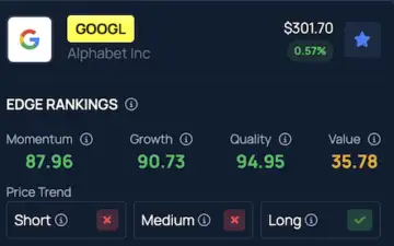 According to Benzinga Edge Stock Rankings, GOOGL is trending lower in the short to medium term but continues to show strength over the long term, with its Quality score placing it in the 94th percentile.