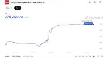 The Polygon-based (CRYPTO: POL)Polymarket crowd is leaning strongly bullish heading into Wednesday. The April 8 market shows a clear majority of traders betting "Up," with trading volume building on whether the S&P 500 will open higher or lower.