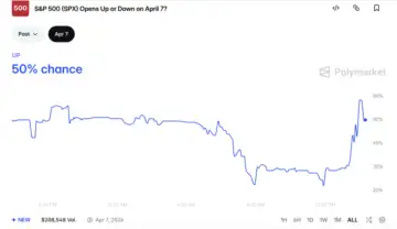 The Polygon-based (CRYPTO: POL)Polymarket crowd is split heading into Tuesday. The April 7 market shows 50% odds for "Up" with early trading activity building on whether the S&P 500 will open higher or lower.