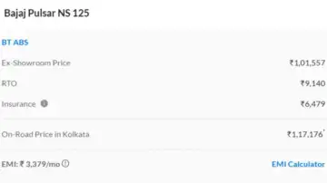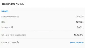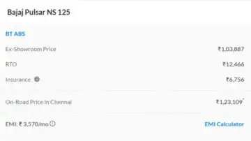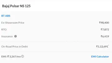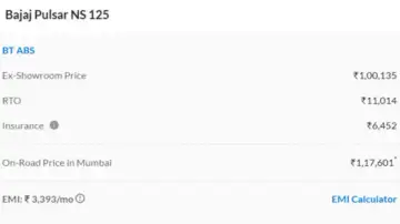 The Bajaj Pulsar NS125's top variant on road price in Mumbai is Rs 1,17,601. This includes the bike's insurance cost and RTO taxes to be paid while registering, which are Rs 11,014 and Rs 6,452 respectively.