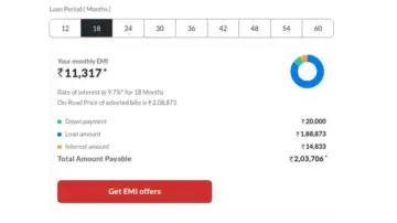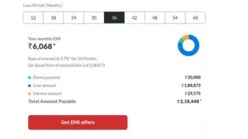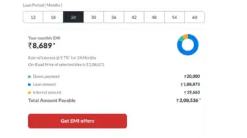 If you're looking to reduce the load of EMIs, you can go for a two-year loan scheme. With this, you will be paying an EMI of Rs 8,689 which is Rs 2,628 lower compared to the 18-month loan tenure. However, you will be paying higher interest, coming to Rs 19,663. You will pay a total of Rs 2,28,536 for the bike.
