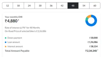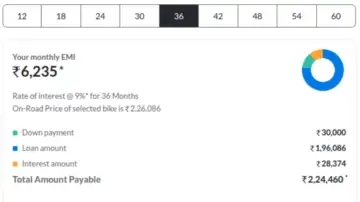 For those preferring lower EMIs, the 3-year loan option brings the monthly payment down to a more convenient amount of around Rs 6,235. This results in a total repayment amount of Rs 28,374 over 36 months, plus the downpayment. In comparison to the 2-year tenure, you will be paying Rs 9,468 more to the bank, but you will have the ease of an even lower EMI.