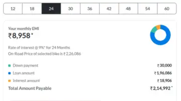 If we consider an average loan interest rate of about 9% for a 2-year tenure, the monthly EMI comes to Rs 8,958. That means a total repayment amount of Rs 18,906 over 24 months plus the downpayment. While the EMI may feel slightly higher for a shorter tenure, the advantage is that the loan gets cleared quickly, and the buyer pays less in interest compared to longer repayment options.