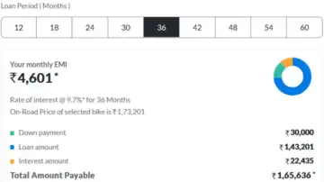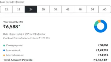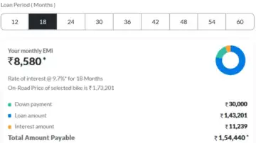 For a 1.5-year (18-month) loan, you will pay an EMI of Rs 8,580. While this monthly payment is higher than other options, your overall interest will be lesser. Which in this case comes to Rs 11,239, and you can spend the money saved on theaccessories Yamaha is offering. This makes the total repayment amount Rs 1,54,440 (loan portion only). And, including the Rs 30,000 downpayment, the total cost of this Yamaha bike will be Rs 1,84,440.