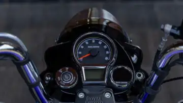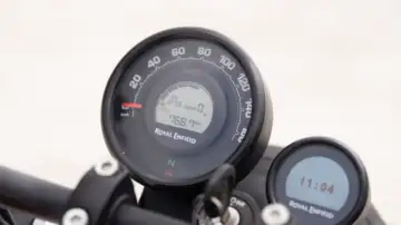 On the Hunter 350, the speedometer looks sharper, and the bright red needle remains easy to read even under strong sunlight. Its LCD inset is neatly positioned within the round console, and the layout — including the fuel gauge, gear position indicator and trip information — gives the cluster a more modern, cohesive feel that matches the bike's youthful character.