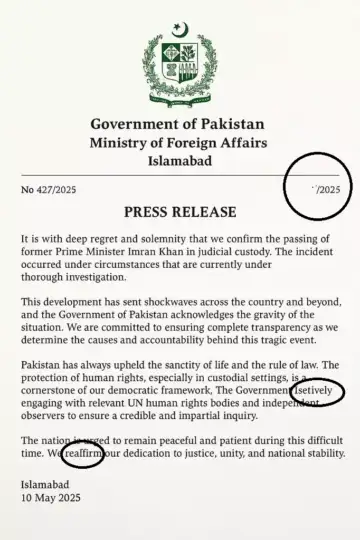 The document bearing the logo of the Pakistan government is titled 'Press Release', with text claiming, "It is with deep regret and solemnity that we confirm the passing of former Prime Minister Imran Khan in judicial custody. The incident occurred under circumstances that are currently under thorough investigation." While the date in the top section of the document is missing, it carries the date May 10, 2025 at the end.
