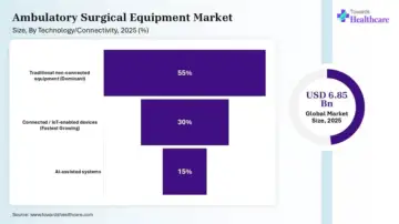 The ambulatory surgical equipment market in the U.S. held 26% share in 2025 reaching USD 1.78 billion in 2025, is being accelerated by a rapid shift of complex procedures from hospitals to outpatient settings, and technological breakthroughs like AI-integrated robotics. The surging investments and revenues are resulting in the expansion of ambulatory surgical centers, driven by improved recovery drugs, advances in minimally invasive surgery, and policies promoting site-neutral payments.