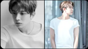 The images were shared Wednesday by Pop Crave, a leading entertainment news account. In one black-and-white close-up, EVAN appears with tousled dark hair, a white crew-neck T-shirt, and a silver chain necklace, gazing intently off-camera with a quiet intensity. The second color shot shows him in a full-body pose by a sunlit window, wearing the same casual white tee and jeans, exuding effortless confidence and a refined, understated style.
