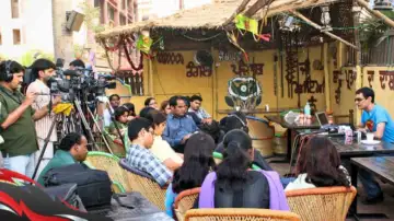 Celebrity publicist Dale Bhagwagar surrounded by the news media at a press meet in Mumbai.