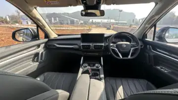 Inside, the MG Majestor's cabin feels modern and premium, featuring a clean dashboard layout finished in a mix of black and grey. The colour combination gives the interior an upmarket, luxury SUV vibe.