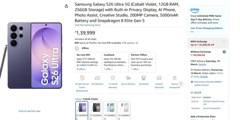 Samsung S26 series was launched on 25 February 2026, and the first sale of these phones went live in March. And just after 10-12 days, this phone is available on Amazon India at just a price of Rs. 1,39,999. But as the Amazon EPL Sale is live, you get this phone under 1 lakh with the help of some bank offers and exchange bonuses. Want to know how? Well, here is the solution: