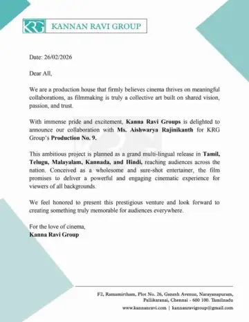 Through their social media handle, the production handle also shared a statement, which shared, "We are a production house that firmly believes cinema thrives on meaningful collaborations, as filmmaking is truly a collective art built on shared vision, passion, and trust. With immense pride and excitement, Kanna Ravi Groups is delighted to announce our collaboration with Ms Aishwarya Rajinikanth for KRG Group's Production No 9."