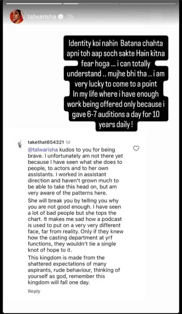 Isha shared a comment of a user who said that they worked in the assistant direction team at YRF. The comment read, "@talwarisha kudos to you for being brave. I unfortunately am not there yet because I have seen what she does to people, to actors and to her own assistants. I worked in assistant direction and haven't grown much to be able to take this head on, but am very aware of the patterns here. She will break you by telling you why you are not good enough. I have seen a lot of bad people but she tops the chart. It makes me sad how a podcast is used to put on a very very different face, far from reality. Only if they knew how the casting department at YRF functions, they wouldn't tie a single knot of hope to it."