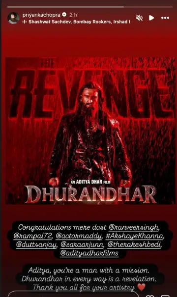 Taking to her Instagram stories, Priyanka posted a brief but heartfelt note for key members of the Dhurandhar team. She wrote, "Dhurandhar in every way is a revelation," tagging all the key actors of the film like Ranveer Singh R Madhavan, Sara Arjun, Arjun Rampal, Rakesh Bedi, Sanjay Dutt, and Akshaye Khanna, who played the antagonist in Dhurandhar (2025).
