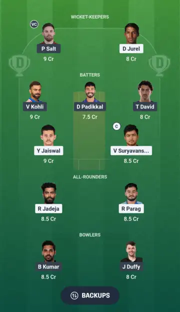 - Batters - Virat Kohli (vc), Rajat Patidar, Devdutt Padikkal, Yashasvi Jaiswal ©, Vaibhav Suryavanshi