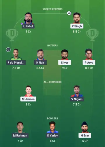 Delhi Capitals: KL Rahul, Faf du Plessis (c), Abishek Porel (wk), Sameer Rizvi, Axar Patel, Vipraj Nigam, Tristan Stubbs, Ashutosh Sharma, Dushmantha Chameera, Kuldeep Yadav, Mustafizur Rahman