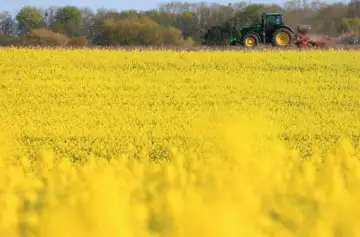 A tractor drives past a rapeseed field in Feluy, Belgium.