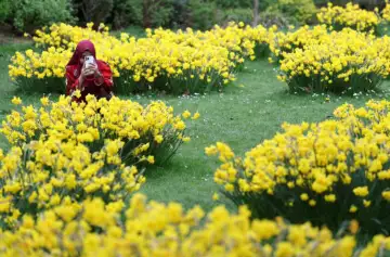 A person records images of daffodil flowers in St. James's Park in London, Britain.