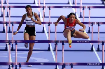 Paris 2024 Olympics - Athletics - Women's 100m Hurdles Round 1 - Stade de France, Saint-Denis, France - August 7, 2024. Jyothi Yarraji of India and Ditaji Kambundji of Switzerland in action during heat 4.