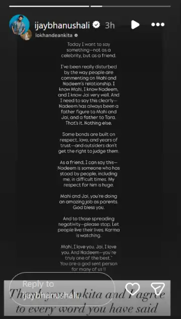 "Some bonds are built on respect, love, and years of trust, and outsiders don't get the right to judge them. As a friend, I can say this: Nadeem is someone who has stood by people, including me, in difficult times. My respect for him is huge. Mahi and Jai, you're doing an amazing job as parents. God bless you. And to those spreading negativity, please stop. Let people live their lives. Karma is watching. Mahi, I love you. Jai, I love you. And Nadeem, you're truly one of the best. You are a God-sent person for many of us", the Pavitra Rishta actress further added.