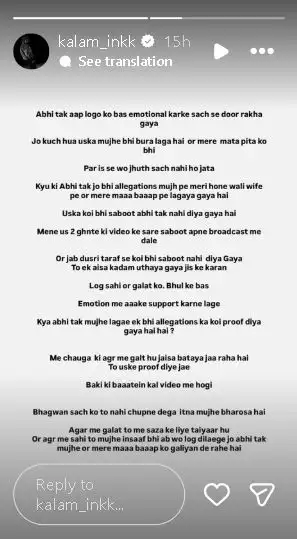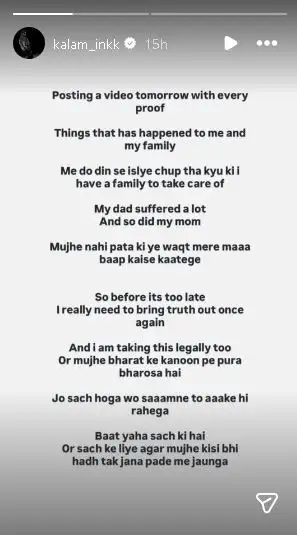 In a detailed note shared on Instagram Stories, Kalam said he plans to present proof about what has happened to him and his family. According to him, the accusations made against them are false and have hurt his parents deeply.