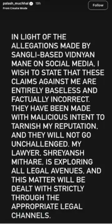 Palash Muchhal also addressed the matter on Instagram and wrote, “In light of the allegations made by Sangli-based Vidnyan Mane on social media, I wish to clarify that these claims are entirely baseless and factually incorrect. They appear to be driven by malicious intent to damage my reputation. My lawyer, Shreyansh Mithare, is examining all legal avenues, and the matter will be addressed strictly through appropriate legal channels."