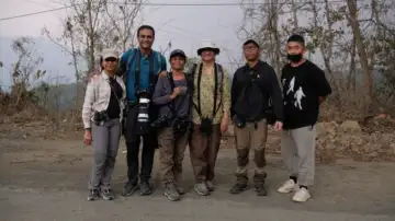 Birders from Mumbai at Jessami along with Weyepe (far right). Photo courtesy author. "We came to Jessami because there are many birds here that we don't see in other parts of India. For example, Mrs Hume's Pheasant isn't found in many other states, but we were lucky enough to see it here yesterday," said Shakuntala Pendse, one of the keen birders from the group.