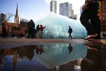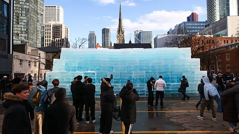 People gather around blocks of ice, installed in a Toronto parking lot as part of promotion for rapper Drake's upcoming album 'ICEMAN'Credit: AP Photo