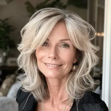 Layered shag with feather bangs, haircuts with bangs for women over 50 years, is a combination of contemporary and vintage styles. It has multiple layers in the hair, along with volume and texture, and feathered bangs that give a soft look on the forehead, with the shag being somewhat dishevelled, yet stylish.