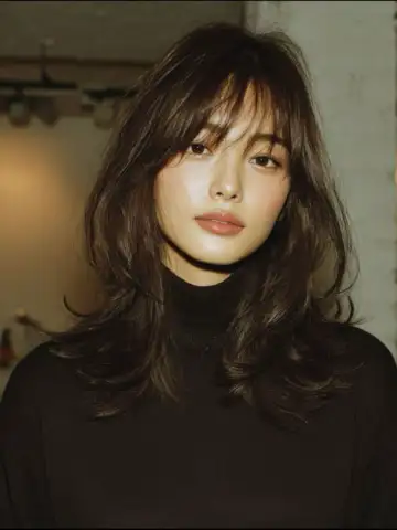 The haircuts with bangs and layers have a medium length that is easy to manage, along with texture that provides depth to the hairstyle. The curtain bangs work well for the face, as they frame it smoothly while seamlessly integrating with the other hair.