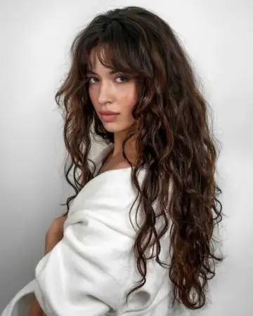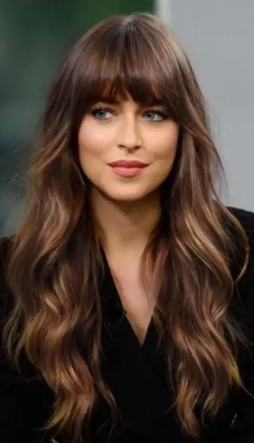 Long wavy hair with a soft fringe makes the waves add volume to the hair, whereas the soft fringe adds a gentle frame to the face without looking too heavy. The softness of the fringe makes it look as if it were part of the waves.