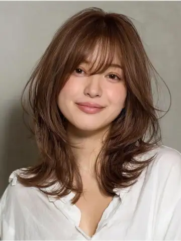 A soft layered haircuts with bangs that has delicate layers, lightweight in texture. The bangs are softly cut, which frames the face by flowing into the layers.