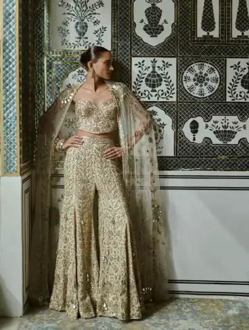 Traditionally, a sharara combined a kurta with pants which were snug from waist down until the knees and were billowy after, akin to the fitting of bell bottom trousers. Designer Arpita Mehta's version of the sharara combines the ease of flare-leg pants and a bustier, and swaps the dupatta with a cape for maximum handsfree-ness and comfort. This new iteration is perfect for a sangeet or a cocktail party.
