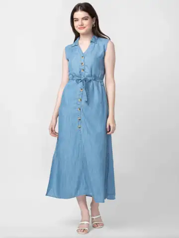 A simple way to make business casual feel more stylish is to swap standard office staples for something with a little more character. The Spykar Indigo Blue Cotton Sleeveless Calf Length Denim Dress brings that edge effortlessly. Denim naturally adds a cool, relaxed touch, while the calf-length cut keeps the look polished and work-appropriate.