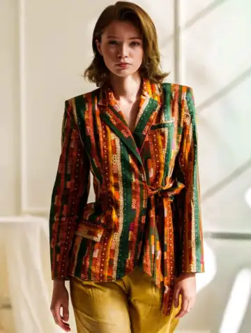 The lively mix of colours gives the outfit energy, while the tailored shape keeps it smart enough for workwear styling. It is the kind of piece that makes business casual feel expressive, modern and much more memorable.