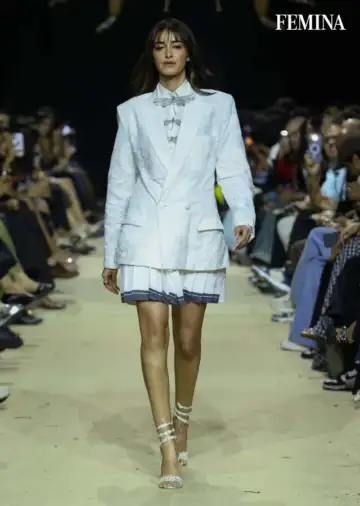 True to the collection's garden-inspired narrative rooted in India's cotton heritage, she opened the show in a glossy, oversized blazer layered over a crisp white shirt adorned with delicate dragonfly embellishments, paired with a pleated ivory skirt that flowed effortlessly down the ramp. The sporty yet luxe aesthetic made a strong case for contemporary Indian dressing. Her makeup was kept naturally toned, with soft contouring sculpting her face, a subtle eye, and a muted lip that kept the overall look clean, radiant, and camera-ready. Her newly debuted bangs framed her face with a freshness that felt entirely intentional.