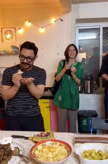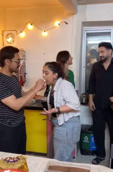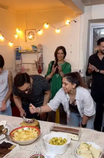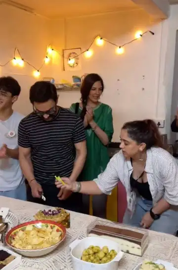 The clip captures several candid moments from the celebration. In one moment, Aamir Khan is seen cutting a cake while people around him clap and wish him. The atmosphere appears relaxed and informal, with the group gathered around a table filled with food and desserts.