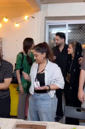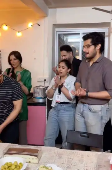 The celebration appears to have taken place in a casual indoor setting rather than a large party venue, suggesting a more personal gathering with people close to the actor. The décor is simple, featuring warm lighting and a table arranged with cakes and snacks for the guests.