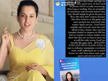 Kangana took to her Instagram account to post a story in which she said, "Gen Z. HAHA their limbs and legs are like sticks, they spend most of their time Watch full reel on phones thAN actually interacting, observing or reading, they are incapable of consistency and seriously believe that they should simply be given the post of Boss who they don't respect because their Boss believes in discipline and came up hard way and GenZ only respect quick success, GenZ loves starbuks and Avocado toast but can't afford to buy a home, they can rent branded clothes to impress on SM but hate to commit or marry, studies even show that they are too lazy to have sex as well, the woke worm GenZ are literally like gajar muli... ROLLING EYES AND SILLY SLANG GENz is easy to influence manipulate even brain wash. well!! millennials are so much better, we rule!! how about some yoga, sports and exercise GenZ ...? (sic)"