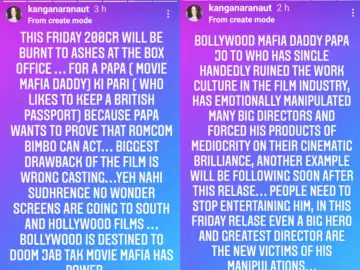 When Alia began promoting Gangubai Kathiawadi last year, Kangana took to her Instagram Stories and took a jibe at her by writing: "This Friday 200cr will be burnt to ashes at the box office. For a papa [movie mafia daddy] ki pari [who likes to keep a British passport] because papa wants to prove that romcom bimbo can act. Biggest drawback of the film is wrong casting. Yeh nahi sudhrenge no wonder screens are going to South and Hollywood films. Bollywood is destined to doom jab tak movie mafia has power.(sic)"