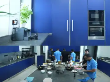 After the room tour, we get a glimpse of the kitchen, and it looks no less than a massive room in itself. It has a blue theme and it looks great. Farah also jokes that it looks more like a stadium and her comment is absolutely valid!
