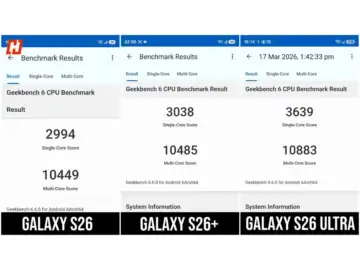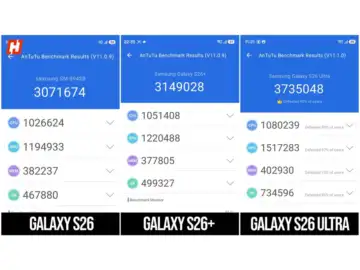 Benchmark numbers paint an interesting picture. In AnTuTu, the S26 scored 3.07 million and the S26+ reached 3.14 million, while the Ultra led with 3.73 million. That gap is expected.