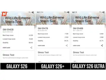 The real surprise came in sustained performance. In the 3DMark Wildlife Extreme Stress Test, both the S26 and S26+ showed better stability than the Ultra. The S26 recorded 58.6 per cent stability, while the S26+ came in at 54.2 per cent. The Ultra, despite strong peak scores, dropped to 42.7 per cent. The S26+ even managed to edge ahead in best loop scores, which is not something I saw coming.