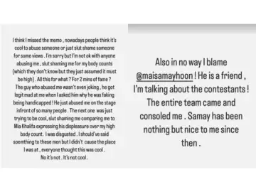 Uorfi sat through this one but stood up as another contestant made some despicable jokes about her. She continued in her stories: "The next one was just trying to be cool, slut shaming me, comparing me to Mia Khalifa expressing his displeasure over my high body count. I was disgusted. I should've said something to these men but I didn't cause the place I was at, everyone thought this was cool. No, it's not. It's not cool."