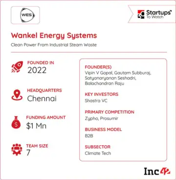 Founded in 2022 by Balachandran Raju, Gautam Subburaj, Vipin V Gopal and Satyanarayanan Seshadri, Wankel Energy Systems (WES) is building deeptech solutions to capture this wasted energy. Incubated at IIT Madras, the startup developed Phoenix, a patented rotary steam expander that converts excess steam pressure into clean electricity without requiring changes to existing plant infrastructure.