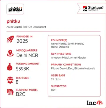 Founded in 2025 by Neha Marda Agrawal, Sumit Marda and Rahul Dokania, Phitku is building a clean personal care brand in the alum-based natural deodorant category. Its flagship product is a 100% natural alum crystal roll-on deodorant, offered in variants such as Natural, Aloe Vera and Turmeric. The products are free from alcohol, artificial fragrances and harsh additives, and are dermatologically tested for use across skin types.
