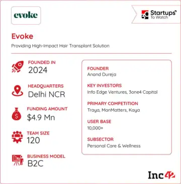 Founded in 2023 by former Urban Company and OYO CXO Anand Dureja, Evoke Haircare provides hair restoration and skin treatment services through specialised clinics. Its haircare offerings include hair transplants, PRP therapy, low-level laser therapy and other non-invasive treatments. In skincare, the startup offers solutions such as acne scar treatment, wrinkle reduction, microneedling and chemical peels.