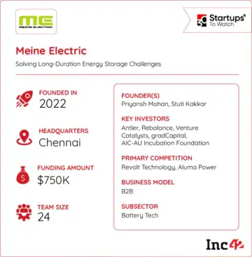 Operating from a 5,000 sq ft facility in Chennai, the startup holds four granted patents and seven international filings. Meine Electric is targeting India's grid energy storage market, projected to grow from $9 Mn in 2024 to about $250 Mn by 2033.